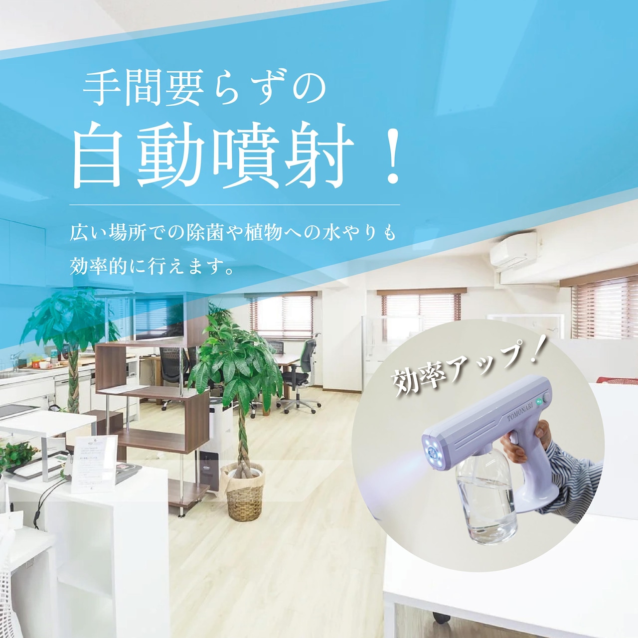 室内や店舗・オフィスなど、広範囲の除菌・殺菌、植物への水やり等が効率的に行えます。